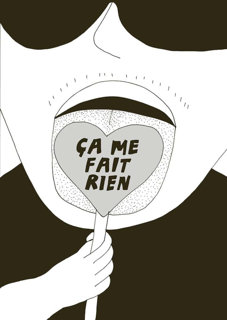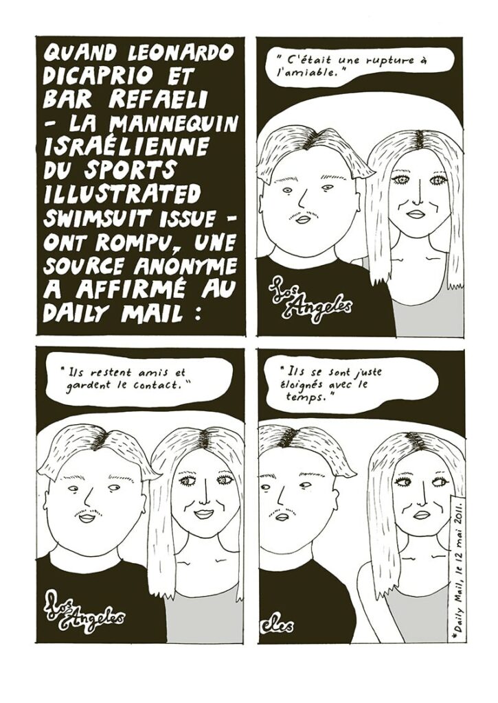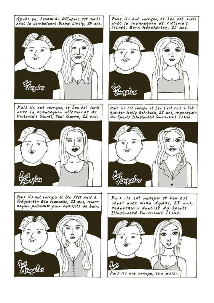 Le livre s’ouvre sur un gros plan d’une bouche léchant une sucette en forme de cœur sur lequel est écrit « Ça me fait rien ». C’est la bouche de Leonardo DiCaprio, totalement déconnecté de ses émotions. Il multiplie les relations avec des mannequins interchangeables. Il refuse leur altérité et elles ne sont là que pour flatter son égo et son narcissisme. Mais tout va bien car elles s’en fichent autant que lui.